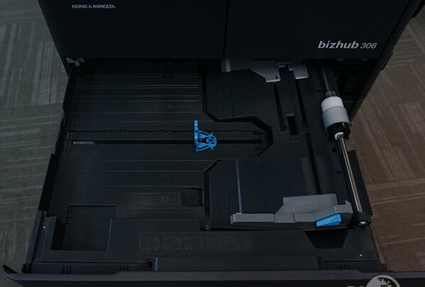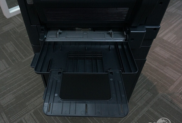 除了標(biāo)配一個(gè)250頁(yè)的進(jìn)紙盒之外,在機(jī)身的側(cè)面,上文提到了許多機(jī)關(guān),其中一個(gè)便可以打開(kāi)多功能手送托盤(pán),柯尼卡美能達(dá)306的多功能手送托盤(pán)支持紙張最大的容量為100張,支持的紙張尺寸為A3到A5。