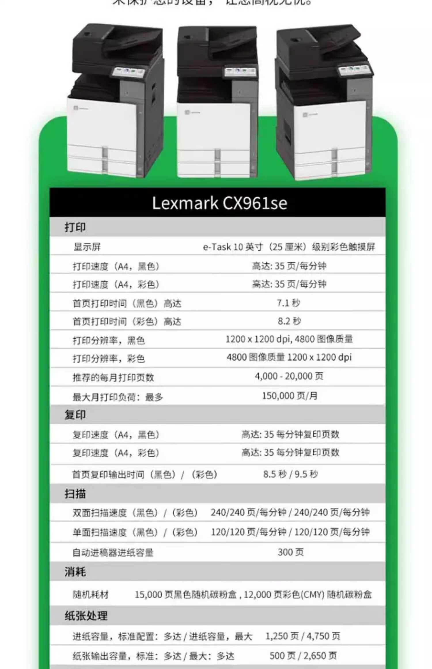 利盟(Lexmark)CX961se復印機 彩色激光多功能數碼復合機打印機 35頁/分鐘 輸稿器 雙紙盒參數圖片